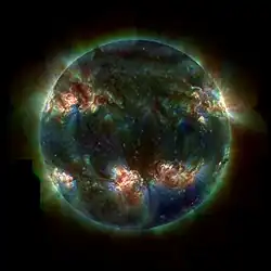X-ray astronomy uses X-radiation, produced by extremely hot and high-energy processes. Since X-rays are absorbed by the Earth's atmosphere, observations must be performed at high altitude, such as from balloons, rockets, or specialized satellites. X-ray sources include X-ray binaries, supernova remnants, clusters of galaxies, and active galactic nuclei.[86] Since the Sun's surface is relatively cool, X-ray images of the Sun and other stars give valuable information on the hot solar corona.[87]