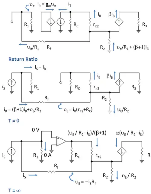 The circuit to determine G is shown in the bottom panel of Figure 7. The introduction of the ideal op amp (a nullor) in this circuit is explained as follows. When T → ∞, the gain of the amplifier goes to infinity as well, and in such a case the differential voltage driving the amplifier (the voltage across the input transistor rπ1) is driven to zero and (according to Ohm's law when there is no voltage) it draws no input current. On the other hand, the output current and output voltage are whatever the circuit demands. This behavior is like a nullor, so a nullor can be introduced to represent the infinite gain transistor.