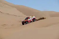 The Atacama Desert is popular with all-terrain sports enthusiasts. Various championships have taken place here, including the Lower Atacama Rally, Lower Chile Rally, Patagonia-Atacama Rally, and the latter Dakar Rally's editions. The rally was organized by the Amaury Sport Organisation and held in 2009, 2010, 2011, and 2012. The dunes of the desert are ideal rally races located in the outskirts of the city of Copiapó.[80] The 2013 Dakar 15-Day Rally started on 5 January in Lima, Peru, through Chile, Argentina and back to Chile finishing in Santiago.[81] Visitors also use the Atacama Desert sand dunes for sandboarding (Spanish: duna).
