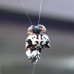 The opisthosoma (abdomen) is large, slightly wider than it is long, and strongly rounded at the front and back.[17][22] It is shiny black with bright colourful patterns. These colours can vary, but they are usually white, yellow, or yellow-orange.[23] Its most distinctive feature are the three pairs of large "spines" projecting outwards. The first two pairs on the front are close to each other, forming a V-shape as they point to the sides. They are short and roughly conical. The spines on the rear are longer and point backwards. There are wide spaces between them and the two front pairs. The spines are black or brownish black from above, but has a yellow-orange to rusty red lower surfaces.[10][17]