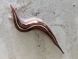 First described as Geoplana scaphoidea by Thomas Steel in 1900. A variable brown colour, 60 to 70 mm long and 4 to 5 mm wide when crawling, usually with stripes. The worm is native to Queensland and possibly northern New South Wales. Spread by the plant trade, this species is now found in other parts of Australia.[1][2][3]