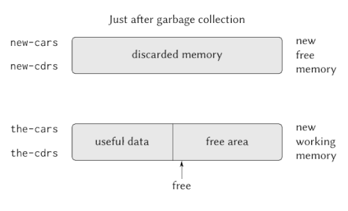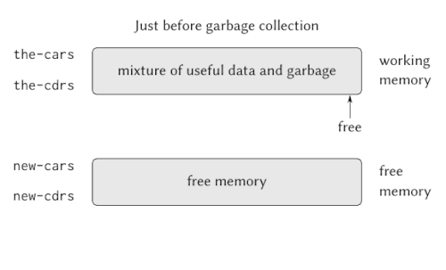 Stop-and-copy garbage collection in a Lisp architecture:[1] Memory is divided into working and free memory; new objects are allocated in the former. When it is full (depicted), garbage collection is performed: All data structures still in use are located by pointer tracing and copied into consecutive locations in free memory.