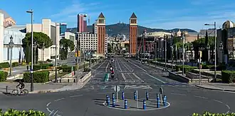 The twin Venetian Towers are a major landmark at the junction of this avenue with Plaça d'Espanya.
