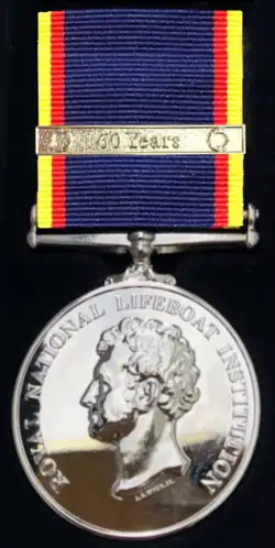 Established in 2020, it is awarded for twenty years service with the RNLI, either as crew or as a support volunteer, and replaces the award of enamel lapel badges. Clasps, attached to the ribbon, are presented to mark each further period of ten years service. Clasps are inscribed 30, 40 50 or 60 Years, as appropriate. By September 2020, a total of 733 medals had been issued, including several with the 60 Year clasp.[19]