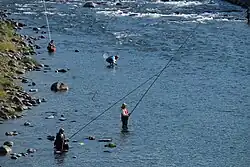 Ayu fishing may be done with lures or with a live decoy.[2] As ayu fish are very territorial, they are likely to attack the live decoy fish used as bait.[3] This fishing method based on habit of strife among Ayu is called Tomozuri (ja:友釣り friend fishing) in Japanese and deemed unique in Japan, but research is propagated from Korean Peninsula as well.[4]