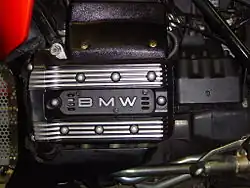 The three-cylinder BMW K75 was developed alongside the K100, but was introduced a year after the K100 as a marketing strategy.[10][11] The K75 engine had the same bore and stroke as the K100, yielding a displacement of 740 cc.[11] Its crankshaft had 120° between the throws[12][13] and was counterbalanced by balance weights added to the water pump accessory shaft, which ran at engine speed as is correct for a 120° straight-three engine.[10] The balance shaft made the K75's engine smoother than the K100's engine.[10][14] To increase the smaller engine's power, the K75's engine was given longer valve timing,[10] the compression ratio was increased to 11.0:1 from the K100's 10.2:1,[10][15] the combustion chambers were redesigned, the intake manifold was shortened, and the exhaust system was retuned.[15] The US market engine, specified to meet Environmental Protection Agency (EPA) requirements, produced 68 hp (51 kW); engines for all other markets produced 75 hp (56 kW).