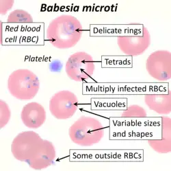 - ^ Akel T, Mobarakai N (February 2017). "Hematologic manifestations of babesiosis". Ann Clin Microbiol Antimicrob. 16 (1): 6. doi:10.1186/s12941-017-0179-z. PMC 5310009. PMID 28202022.