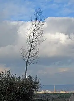 On September 21, 1922, the Gebirgsvereinssektion Golberode-Babisnau, serving as the builder, celebrated the inauguration of a new four-meter-high lookout scaffold. This construction took two weeks to complete. A redthorn hedge was planted in 1925.[13] A decree issued by the district governor of Dresden-Bautzen on December 28, 1936, designated the poplar as a natural monument under the Reichsnaturschutzgesetz (RNG) 128 years after its planting.[14] From 1944 until the end of World War II, an anti-aircraft squadron was stationed at the poplar.[8] As the German lines on the ground failed to hold, the poplar stood at the center of the war effort, and shortly before the war's end, there were plans to cut it down due to its status as a prominent visual marker. However, these plans were not carried out. In 1945, the Mountain Club disbanded, and the parcel containing the poplar and the Bismarck oak came under the care of the municipality of Bärenklause-Kautzsch.[15] In 1957, Babisnau was annexed to the municipality of Bärenklause-Kautzsch in the district of Freital. A year later, on August 23, 1958, the Freital District Council designated the poplar as a natural monument for the second time in a resolution (108/58). During the late 1950s, the lookout structure was closed by the building authorities due to its unsafe condition resulting from weathering and wanton damage. However, in 1962/63, the Friends of Freital built a new steel viewing platform to replace the old one.[16] On June 21, 1961, the Babisnau poplar with parcel 36a and the two surrounding parcels 35a and 40 were declared public property, which made them subject to state administration.[12] However, the care remained with the municipality. During a strong thunderstorm on July 20, 1967, with hail following temperatures of 30 degrees Celsius, the poplar lost a third of its now large crown.[17] One of the three main shoots going upward broke off, causing the crown to lose its spherical shape.[17] The height was reduced from about 26 to about 20 meters.[18] Because of its size, two tractors were needed to haul away the broken branch. From then on, the crown of the Bismarck oak, which was also large by then, increasingly took over the role of an eye-catcher from afar.[19]