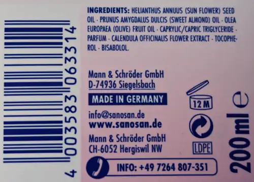 Vegetable oils are produced by plants with the highest concentration being present in seeds and fruits. About 95% of each vegetable oil is primarily composed of triglycerides. Coconut oil and palm oil contain mainly saturated fatty acids, while other oils largely contain unsaturated fatty acids, for example oleic acid and linoleic acid. Accompanying substances in vegetable oils are, inter alia, phospholipids, glycolipids, sulfolipids, squalene, carotenoids, vitamin E, polyphenols and triterpene alcohols.[7] To avoid rancidity, preservatives or antioxidants are added to baby oils based on vegetable oils.[3] On cosmetic products, these oils are listed according to the International Nomenclature of Cosmetic Ingredients (INCI), e.g.:[8]