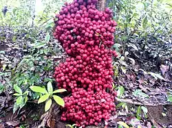The flowers are scarlet in colour and dioecious. Inflorescence are in long stalks arranged in clusters growing on the trunk of the tree i.e. cauliflorous.[5] Male inflorescence is clustered all over the trunk. Female inflorescence is clustered mostly at the base of the trunk.[3] The fruit are globose, crimson coloured and ribbed.[6] Fruits are sour to sweet in taste when fully ripe. Pollen size 10 to 12 μM.[7]