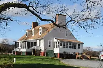 The house has its entrance in the central bay; unusually, the door is flanked by 2/2 sidelights on each side. The rest of the main facade, which faces south towards the old road to Queenstown, is arranged symmetrically; on the first floor, two 9/6 sash windows may be found on either side of the door. Above these are three gable-roofed dormers with 6/6 sash. The facade also has a modern, three-bay porch. The back facade of the house is similar to the front; the paneled door in the center bay has no sidelights, but is flanked on each side by 6/6 windows. Three gable-roofed 6/6/ sash dormers sit above the central door.[2]