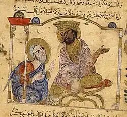 The 1237 edition of the Maqamat al-Hariri is an illuminated manuscript created by Yahya ibn Mahmud al-Wasiti in 1237. This is probably the most applauded edition of the Maqamat.[18] It may have been created in Baghdad, based on some stylistic parallels with the Kitab al-baytarah which securely emanated from this city, but this attribution remains quite conjectural.[3] Still the name of the Abbasid Caliph al-Mustansir appears in one of the paintings (fol. 164v), which does create a certain connection.[11]