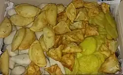 Nunor Bora is a savoury snack made of rice flour and with onion, ginger and turmeric, fried to a golden colour.