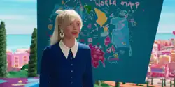 The ending of the film features Barbie saying the line "I'm here to see my gynecologist", with Gerwig describing it as a "mic drop kind of joke". She had chosen to include the line as she had wanted to instill confidence in younger girls, as she had been embarrassed about her body when she was younger.[67] Barbie also explores the negative consequences of hierarchical power structures, with Gerwig saying that she extrapolated that "Barbies rule and Kens are an underclass" and felt it was similar to the Planet of the Apes.[65] Ken has low self-esteem and seeks approval from Barbie, which Gerwig identified as a good source for a story. Gosling compared Gerwig's vision to Milton Glaser's I Love New York logo as he felt Gerwig created the film's characters as a way of understanding the contemporary world.[68] Ken has the only power ballad in the film, and Gerwig had identified it as the moment in which she felt the film transcended what a Barbie film traditionally should have been.[5][69]