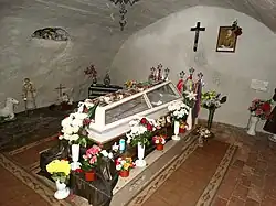 Barbora was first buried either in Žvelgaičiai or Umiastowski family crypt. However, due to growing veneration of Barbora, her body was moved to the old church of Žagarė. In 1655, during the Second Northern War, Sweden invaded Lithuania and burned down the church. Barbora's body and hair was blackened, but otherwise untouched by the flames;[1] as a result, her cult grew stronger. Tsarist authorities discouraged Catholicism and the crypt was walled up in 1877 on orders of Pyotr Albedinsky, Governor-General of Vilna;[6] it was reopened in 1896.[2] The remains were put in a glass coffin in the crypt beneath the high altar. In 1906, an entrance was made to the crypt from outside to ease access.[7] In 1963, during an anti-religious campaign in the Soviet Union, authorities of the Lithuanian SSR closed the church and transferred the remains of to an unknown location.[2] At the same time, forensic pathologist and MGB agent Juozas Markulis analyzed the body, but his work did not survive.[7] Reportedly, the Soviets considered displaying the remains at the Museum of Atheism.[5] Efforts to locate the remains were unsuccessful. When the church was returned to the congregation, a symbolic casket was placed in the same crypt.[7]
