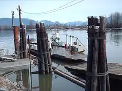 Propelled by an attached tugboat, the barge[31] can carry up to 6 vehicles and 52 passengers, but when 6 vehicles are aboard, the residual capacity is 28 passengers.[32] The crossing time is usually five minutes. The ferry terminal landing is accessed from British Columbia Highway 1 by taking exit 53 into Port Kells, Surrey and proceeding to the end of 104th Avenue.[31]