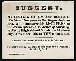 In September 1854, Lister's house surgeoncy appointment was finished.[108] With the prospect of being out of a job, he spoke to his father about seeking a position at the Royal Free Hospital in London.[108] However, Sharpey had written to Syme warning him that it was unlikely that Lister would be welcome at the Royal Free as he would have likely eclipsed Thomas H. Wakley, whose father held considerable sway at the hospital.[109] Lister then made plans to tour Europe for a year.[110] However, an opportunity presented itself with the death of noted infirmary surgeon and surgical lecturer at the Edinburgh Extramural School of Medicine Richard James Mackenzie.[111] Mackenzie had been seen as a successor to Syme[111] but had contracted cholera in Balbec in Scutari, Istanbul, while on a four-month volunteer sabbatical as field surgeon to the 79th Highlanders during the Crimean War.[30] Lister proposed to Syme that he take over Mackenzie's position and become assistant surgeon to Syme.[110] Syme initially rejected the idea, as Lister was not licensed to operate in Scotland, but later warmed to the idea.[110] In October 1854, Lister was appointed as a lecturer[112]Lister successfully transferred the lease held by Mackenzie at his lecture room at 4 High School Yards, to himself. On 21 April 1855, Lister was elected a Fellow of the Royal College of Surgeons of Edinburgh[113] and two days later rented a home at 3 Rutland Square.[30] In June 1855, Lister made a hurried trip to Paris to take a course on operative surgery on the dead body and returned in June.[113]