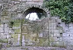 This wing was constructed in 1627 at right angles to the old keep using rubble faced with dressed with sandstone ashlar.[22] A door was broken through from the hall of the old keep to a staircase in the mansion house. The mansion was a fine specimen of 17th-century architecture.[18] It had turrets corbelled out at hall level and these contained closets. The front door was set in an unusual shallow projection and a narrow back door at the north facing aspect led into a courtyard. Two cellars existed with a passage between them that connected with the main staircase.[17] The hall in the old tower may have been used as a dining area and the large room in the mansion house utilised as a drawing-room.[18] The most southerly turret and a large part of mansion house wing fell at some point between 1956 and 1964.[23]