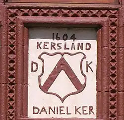 Over the main entrance door of the dwelling house is a carved stone removed from the old manor house bearing the arms of the Ker family, with an inscription "Daniel Ker Kersland - 1604". This date stone has been touched-up with paint.[6] Karrisland (sic) is recorded on Timothy Pont's map c. 1604, as are the placenames Karshead, Todsle, Dysil, and Achingry.[7] In 1685 'Carsland' is shown.[8] The property had been surrounded by trees and had an orchard of considerable extent.[9] Kersland Mains was on the entrance lane from Dalry and became Wester Kersland Farm when the manor house/castle was demolished.