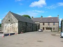 The ancient mansion or castle[3] of Kersland stood on Easter (now 'East') Kersland Farm. The remains of the 'L-Plan' tower has been built into the farmhouse. The barmkin wall survives and has a surviving strong defensive corner tower.[4] Paterson records that the house was almost entirely pulled down by the feuar, Robert Ker.[5] The remaining two barrel vaulted chambers, later used as a dairy and stable, with walls 8 ft thick, until recently formed part of the offices attached to East Kersland.