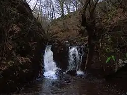 The Ladyland Burn runs through the site, probably deriving its name from a typical pre-reformation chapel, long forgotten, such as those at Trearne, Blair House, Chapeltoun House, etc. The Maich Water rises from Mistylaw Muir and runs through an attractive Glen nearby with a small reservoir upstream created by Renfrew County Council of old. The Maich Water forms the Local Authority boundary here and harbours a geocache upon its course before it empties into Kilbirnie Loch. The Smuggler's Cave is on the side of the Maich Water, formerly reached through an entrance guarded by sandstone pillars off the driveway. An impressive main entrance off the road from Ford Cottage sets the stage for the rural and aristocratic nature of Ladyland. The 'Sheep Linn' is situated on the Maich Water above Cockston Farm.[19]