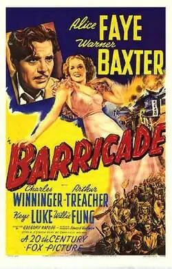 Barricade is a 1939 adventure film directed by Gregory Ratoff and starring Alice Faye, Warner Baxter, Charles Winninger, Arthur Treacher, and Keye Luke.[1]