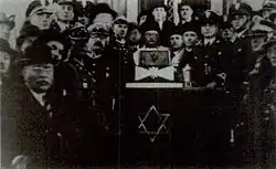 During the First World War his family moved to Vienna; there in 1916 he was elected a rabbi, passing the required examinations in the following year and returning to Przemyślany.[1] He joined the Polish Military Organisation, providing services for Polish Jewish soldiers.[1] In November 1918 he volunteered to join Polish forces in the Polish-Ukrainian war, he fought alongside the Polish forces in the battle of Lwów and remained on the frontlines until Polish forces took control of Przemyślany in May 1919.[1]
