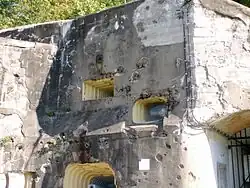 In the northern section of the fort, similar actions were taking place, as the airborne troops raced to destroy or otherwise disable the fortifications housing artillery pieces. Objective No. 13 was a casemate housing multiple machine-guns whose arcs of fire covered the western side of the Fort; to destroy the casemate, the airborne troops used a flamethrower to force the Belgian soldiers manning the weapons to retreat, and then detonated shaped charges against the fortification to disable it.[24] Another observation cupola fitted with machine-guns, Objective No. 19, was destroyed, but two further objectives, Nos. 15 and 16 were found to be dummy installations. Unexpected complications came from Objective No. 23, a retractable cupola housing two 75mm artillery pieces.[26] It had been assumed that the weapons in this fortification could not stop the airborne assault, but this assumption was found to be false when the weapons opened fire, forcing the airborne troops in the area to go to cover. The rapid fire of the weapons led to air support being summoned, and a Stuka squadron bombed the cupola. Although the bombs did not destroy the cupola, the explosions did force the Belgians to retract it throughout the rest of the fighting.[24] Any exterior entrances and exits located by the airborne troops were destroyed with explosives to seal the garrison inside the Fort, giving the garrison few opportunities to attempt a counter-attack.[23] The airborne troops had achieved their initial objective of destroying or disabling the artillery pieces that the fort could have used to bombard the captured bridges, but they still faced some small cupolas and emplacements that had to be disabled. These included anti-aircraft weapons and machine-guns.[26]