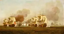 Reggio realized the convoy he had sighted was in actuality the British Jamaican squadron.[5] Immediately he signalled his command to steer to leeward to facilitate the formation of a line ahead bringing him to almost the same course as Knowles.[15] The result of this however meant that he had lost the weather gauge whilst Knowles on the other hand was in a favourable position to obtain it.[16] Knowles gave the signal for the ships in his line to "lead large" with the Spanish on a more convergent course.[17] With the afternoon change in the wind the two leading ships Canterbury and HMS Warwick in Knowles' line drifted within long range of Reggio's centre which then opened fire on them. Knowles had issued standing orders to his entire command to hold their fire but despite this the lead ships returned the fire of the Spanish.[17]