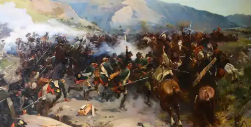A part of the Dagestani infantry, which had crossed to the left bank of the Iori by that time, also rushed at the cavalry of the Jaeger battalion, opening rifle fire at it from a long distance. However, the mountaineers' firing from smoothbore rifles at that distance was not effective and did not actually cause any harm to the Jaegers. At the same time, the volley fire from the Jaegers' rifled rifles inflicted considerable damage on their infantry in killed and wounded, after which they were driven into disorderly flight.[72]