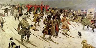 The Russian historian A. Lobin tried to calculate the size of the Muscovite army at Orsha based on the mobilisation capacities of the towns which had to send townspeople for military service.[14] It is known that except for Boyar sons of the sovereign's regiment, the army consisted of people from at least 14 towns: Novgorod, Pskov, Velikie Luki, Kostroma, Murom, Borovsk, Tver, Volok, Roslavl, Vyazma, Pereyaslavl, Kolomna, Yaroslavl, and Starodub.[15] Based on figures from the well-documented Polotsk campaign of 1563, the author gives the following estimates: 400–500 Tatars, 200 boyar sons of the sovereign's regiment, 3,000 Novgorodian and Pskovians, and about 3,600 representatives of other towns, altogether about 7,200 noblemen. Once servants are included, the overall size of the Muscovite army could be 13,000–15,000 men. Considering the losses during the campaign, the level of desertion which is documented in the sources and the number of soldiers left as a garrison in Smolensk; the number of Muscovite troops present at Orsha could have been as low as about 12,000 men.[6] This calculation method has been backed by Brian Davies (University of Texas at San Antonio),[16] and Russian historians N. Smirnov, A. Pankov, O. Kurbatov,[17] М. Krom,[18] and V. Penskoy.[19] An earlier estimate also noted that at the beginning of the 16th century, the Russia could not even gather 40,000 in its ranks.[7] Vitaly Penskoi analyzing the structure of the Russian army, also came to the conclusion that in the largest military campaigns under Vasily III, Muscovites could not have more than 20,000.[20]