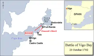 On the evening of 22 October the Anglo-Dutch fleet entered the Ria de Vigo, and sailed past the two forts of the city of Vigo that fired at them as they passed by. At the end of the bay the French fleet and Spanish treasure ships lay in the harbour of Redondela, surrounded by the Galician mountains. Châteaurenault had taken charge of the defensive measures, and had blocked the narrow entrance, across the Rande Strait, with a boom made largely of timber and chain tightly bound together.[14] At the north end of the boom was positioned a gun battery which, according to Rooke's journal, comprised "fifteen or sixteen" guns; at the south end sat Fort Rande sitting a little way up from the sea, consisting of a strong stone tower with platforms constructed for cannon. The space between the tower and the water's edge consisted of a fortified enclosure, at the bottom of which stood a battery commanding the straits. In total, the Rande fortifications had been armed with more than 30 guns. To supplement the French troops from the fleet, a number of levies were raised by the Prince of Barbançon, governor and captain-general of Galicia.[11]