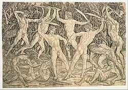 The Battle of the Nudes or Battle of the Naked Men,[1] probably dating from 1465–1475, is an engraving by the Florentine goldsmith and sculptor Antonio del Pollaiuolo which is one of the most significant old master prints of the Italian Renaissance. The engraving is large at 42.4 × 60.9 cm, and depicts five men wearing headbands and five men without, fighting in pairs with weapons in front of a dense background of vegetation.