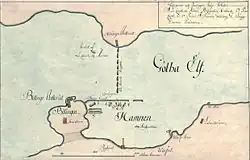 Two of the Gothenburg Squadron's frigates, the Fredericus and the Halmstad had been leased to the Gathenhielm privateers. The Halmstad was equipped, but undermanned. These two frigates as well as an additional two from Nya Varvet, formed a blockade in Göta älv between Nya Varvet and Rya Nabbe. Strömstierna supplied the vessels with barricades so as to prevent the Danes from boarding them.[19] Additionally, Nya Älvsborg fortress had been reinforced with a crew of 400 soldiers and 90 cannons. The two cannon batteries Lilla Billingen and Rya Nabbe, with 12 heavy cannons each had been manned with infantry from the Saxon Infantry Regiment led by Colonel G.D Zengerlein. In addition, the Småland Regiment as well as an elite unit, the Grenadier Battalion led by Johan Clausen, which composed of handpicked grenadiers from different units, were assigned to man the forts. In total, there were around 1000 Swedish soldiers and 200 cannons at the rivermouth of Göta älv.[20]