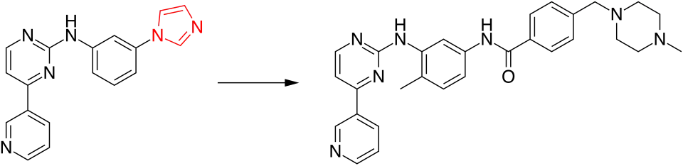 In the development of imatinib, the structure of Bcr-Abl tyrosine kinase played a limited role because it was unknown.[8] A high-throughput screening of chemical libraries at Novartis was performed to identify a starting molecule, which was called "Pyrimidine A". This compound served as a lead compound and was then tested and modified to develop imatinib.[10] With a replacement of the imidazole group with a benzamido group, the compound's specificity increased while its activity as a kinase inhibitor remained the same. Subsequently, introducing a methyl substituent ortho to the pyrimidinyl-amino group enhanced the potency.[5]