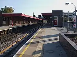 The station has four platforms, of which two are used by the District line and another two are disused since the LT&SR service was withdrawn in 1962.[16][17] One of the platforms is fenced off from the westbound District line platform. The single-storey brick station buildings are of typical 1930s design which are also constructed at Dagenham East, Hornchurch and Upminster at the time. Station refurbishment works were completed by Metronet in 2006,[20] where heritage features were restored, CCTV equipment replaced and PA system enhanced. New wall tiles and ceilings were clad, and new tactile strips, customer Help Points and better lighting were installed. Whilst these works were done between 2005 and 2006, the station was closed on several weekends whereby replacement buses operated to Dagenham Heathway station.[21]