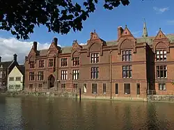 By the 1960s the council had outgrown the Shire Hall, having numerous overflow offices around the town. It decided to build a new County Hall, choosing a site on Cauldwell Street on the south bank of the River Great Ouse, opposite the Shire Hall, in Bedford. The new building was designed by the deputy county architect, Douglas Chalk, under the supervision of the county architect, John Barker.[22] The council moved into the new building in November 1969. It was officially opened by Katharine, Duchess of Kent in October 1970.[23]