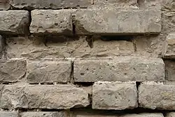 The inner city wall stood 11.4 m (37 ft) high and were topped with battlements that rose a further 1.9 m (6.2 ft).[11] The wall, lined with brick and filled with rammed earth, was 19.8 m (65 ft) thick at the foundation and 16 m (52 ft) at the top.[11] Bastions protruding on the outside face of the wall are locally known as mamian or "horse face". The bastions, spaced about 80 m (260 ft) apart, allowed archers to fire at attackers from three sides.[8] The restored fortification has 11 bastions on the southern wall and two bastions on the shorter eastern wall. Only the battlements of the corner tower and one bastion has been fully restored.