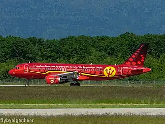 Just before the kick-off of a 2014 World Cup home qualifier, Belgium's footballers saw a tifo banner, sized 10.5 by 11.5 metres (34 by 38 ft) depicting a devil in the national colours.[146] The presence of many Belgian players in top leagues abroad, such as the Premier League,[147] and promising results under Marc Wilmots, increased fans' enthusiasm and belief in a successful World Cup campaign.[115][148] Because of this popularity, two Belgian monuments were decorated in national colours for the 2014 FIFA World Cup; the Manneken Pis statue received a child-sized version of the new Belgian uniform,[149] and facets of the Atomium's upper sphere were covered in black, yellow and red vinyl.[150]