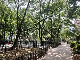 Construction of a $5 million renovation of the park began in May 2022, which includes the replacement of the south playground with an ADA-accessible dog run, reconstruction of the north playground and basketball court, and the installation of community gardens and additional lighting along the central plaza.[1][17] The improvements to the park came as a result of several years of discussions with local residents, a group of which specifically requested an accessible dog run and worked to have a temporary dog run opened in the park at the beginning of 2018.[18][19] Other community members wanted to improve the safety of the park by moving the adult fitness equipment away from the playgrounds and removing park benches to dissuade the homeless from loitering near the areas where children play.[20] The renovations to the park were completed in June 2023.[21]