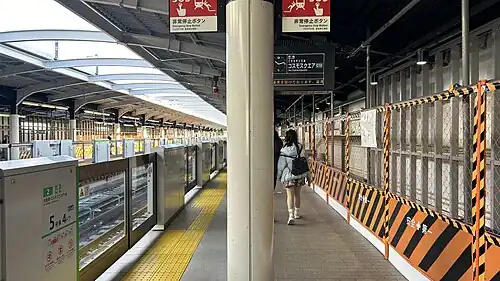 Station numbering was introduced to the JR West facilities in March 2018 with the Osaka Loop Line platforms being assigned station number JR-O15.[1][2]