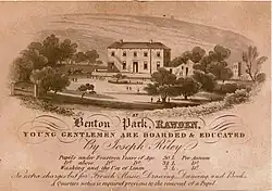 Benton Park school was built in the grounds of old Benton Park house. The school was established by Joseph Riley in 1838 and by 1851 he had 33 boys in residence. His son John was also a teacher there.[3] In the 1860s it was bought by the Milligan family for use as a private home and was not used as an educational establishment until Littlemoor School utilized the premises as a senior department from 1951 until 1957 when the building was demolished.
