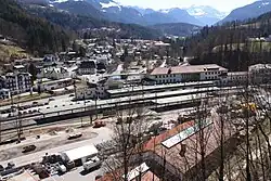 Berchtesgaden Hauptbahnhof (German for Berchtesgaden main station; sometimes translated as "Central Station"[2][3]) is a railway station in the Bavarian market town of Berchtesgaden, the smallest town in Germany with a Hauptbahnhof. It has five platform tracks and is classified by Deutsche Bahn as a category 5 station. It is the terminus of the Freilassing–Berchtesgaden railway. Previously the Berchtesgaden–Hangender Stein railway, also called the Grüne Elektrische ("Green Electric") started from the station. Within walking distance of the station (Triftplatz) was the former station (Königsseer Bf) of Königssee Railway (German: Königsseebahn), which served the lake of Königssee. The station is served by about 20 trains daily operated by Deutsche Bahn and the Berchtesgadener Land Bahn.