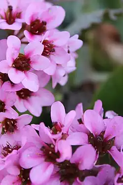 Bergenia /bərˈɡɛniə/[2] (elephant-eared saxifrage, elephant's ears) is a genus of ten species of flowering plants in the family Saxifragaceae, native to central Asia, from Afghanistan to China and the Himalayan region.
