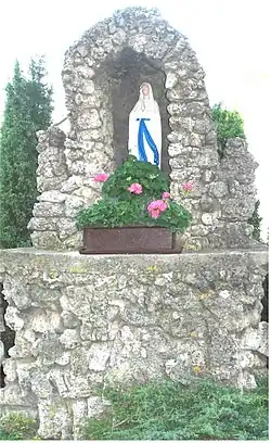 In 1933, villagers under the leadership of Messrs. Rollinger, Bunsen, and Huss built the Muttergottesgrotte (Mother of God Grotto), in the atrium of the church. It was built using many fossilized sea shells collected near Beringen. The impulse to build this grotto may have been inspired by the 1933 canonization of St. Bernadette.[4]