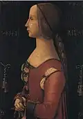 Portrait of an affluent woman. Rumored to be sitter for Leonardo da Vinci's La Belle Ferronnière and Lady with an Ermine.