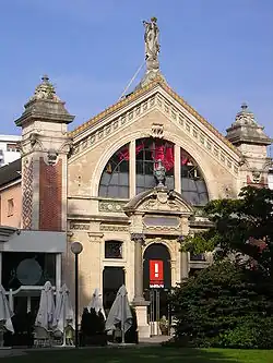 The foundation stone of the casino was laid on August 3, 1891,[8] followed by a ceremony featuring speeches from various notable figures, including Achille Vialatte. This event was similar in grandeur to the opening of the Grand Hotel.[14] The Besançon-les-Bains casino was inaugurated on July 10, 1892, with a grand evening event that included a concert, ballet, and fireworks over the Doubs River.[16][17] The building is situated within the gardens, exhibiting asymmetrical façades crafted from dressed stone. These façades are embellished with a plethora of decorative elements, including brightly colored ceramics, bronze ornaments, and sculptures.[18] To the left of the casino were the gaming rooms and the "cercle", in the center of the restaurant, and to the right the festivity hall, all connected at the front by an imposing marquee.[18] The "cercle" pavilion offered many gaming options, predominantly in the Greek Campana style. Additionally, it provided a reading room, a large salon adorned by sculptor Injalbert and painter Allard, a small salon in the Louis XVI style draped in silks, and a Japanese-style salon.[18]