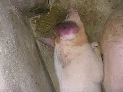 The designation of the term "high pathogenicity" tends to be relative. In general, the highly pathogenic PRRS shows higher reproductive failure rate in pregnant sows, high morbidity and high mortality in pigs of all ages.[20][49] Infected pigs display a range of respiratory (dyspnea, sneezing, coughing) and systemic clinical signs (a long-lasting high fever of over +41 °C, depression, anorexia, discoloration of the skin and the ears), conjunctivitis.[20][50][51] Neurological signs could be seen in some cases.[52] The common lesions at necropsy may include inflammation of lungs and lymph nodes, fibrinous pleuropneumonia and pericarditis, peritonitis.[20][50]