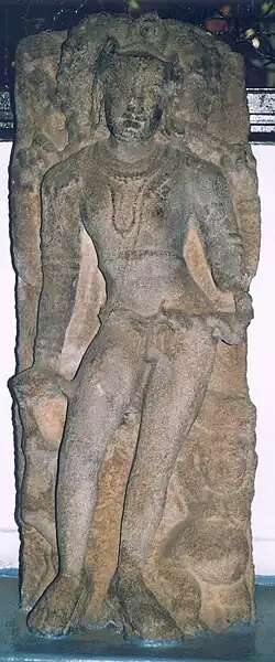 The iconography of Bhikshatana is discussed in all Shaiva Agamic texts, including Amshumadbhedagama, Kamikagama, Supredagama, Karanagama and the iconographic work Shilparatna; the texts are mostly South Indian in origin.[27] The iconography is quite similar to that of the Kankala-murti aspect who, like Bhikshatana, is associated with the legend of Shiva's atonement for severing Brahma's head. The chief difference is that Bhikshatana is nude and Kankala-murti is clothed.[28]