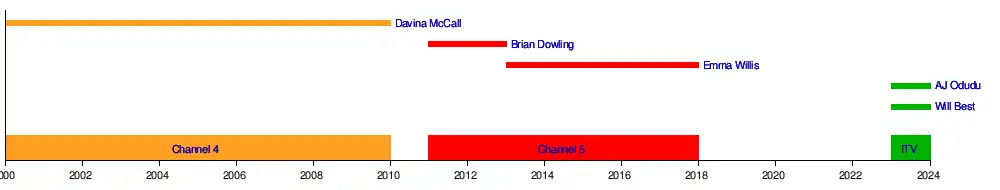The programme was initially presented by Davina McCall MBE from its inception in July 2000 until its cancellation by Channel 4 ten years later. McCall declined to return as presenter following the programme's move to Channel 5, and the role was taken up by former series winner Brian Dowling. He remained as presenter throughout the twelfth and thirteenth series.[10] Emma Willis later replaced Dowling from the fourteenth series onwards until its cancellation from Channel 5.[11] On 25 April 2023, ITV announced AJ Odudu and Will Best as hosts of both the main show and a "nightly spin-off" show. Marcus Bentley served as the off-screen narrator of all series since the show premiered in 2000. Big Brother has had numerous spin-off series occur since its premiere, most notably Celebrity Big Brother, a shorter version of the main series wherein the cast is composed solely of celebrities. Numerous other spin-off series that are not competition based have aired, with Dermot O'Leary,[12] Russell Brand,[13] George Lamb,[14] Emma Willis and Rylan Clark all presenting spin-offs.